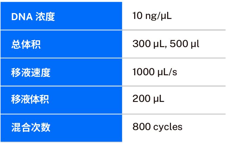 采用 Opentrons Flex 自動(dòng)化移液工作站執(zhí)行移液剪切操作。將 DNA稀釋于 LTE 緩沖液(PacBio,產(chǎn)品編號:103-228-900)中,并置于 Nest 2 mL 深孔板內(nèi)(Opentrons,產(chǎn)品編號:999-00103)。根據(jù)表 1 所示條件進(jìn)行剪切操作。
