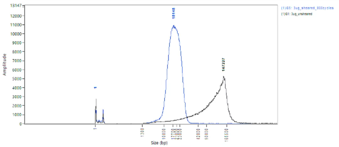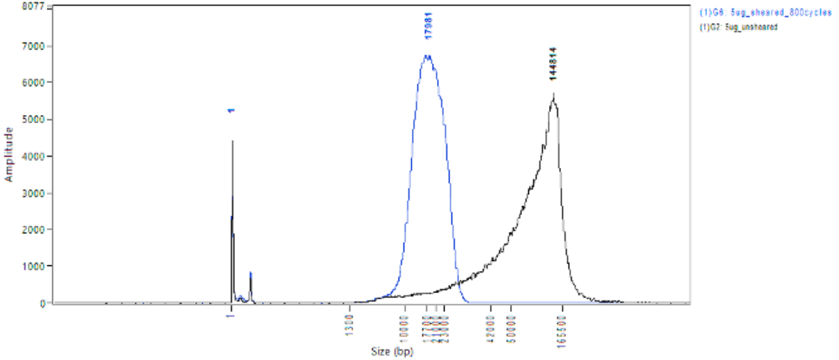 (B) 剪切前(黑色)和剪切后(藍(lán)色)的 5 μg 高分子量 DNA。剪切后的 DNA 平均片段大小為 17,665 bp。