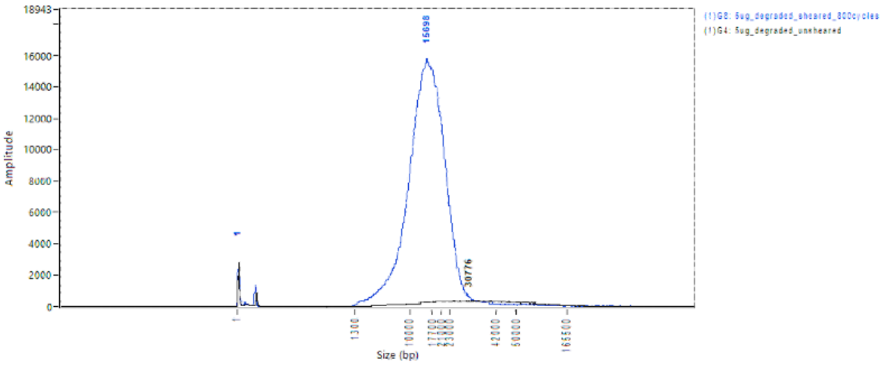 (B) 剪切前(黑色)和剪切后(藍(lán)色)的 5 μg 降解 DNA。剪切后的 DNA 平均片段大小為 15,916 bp。