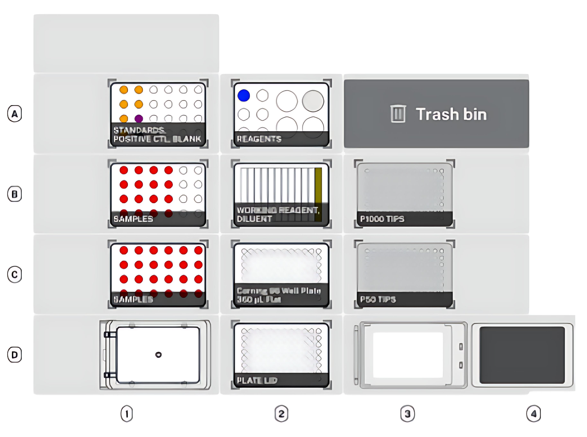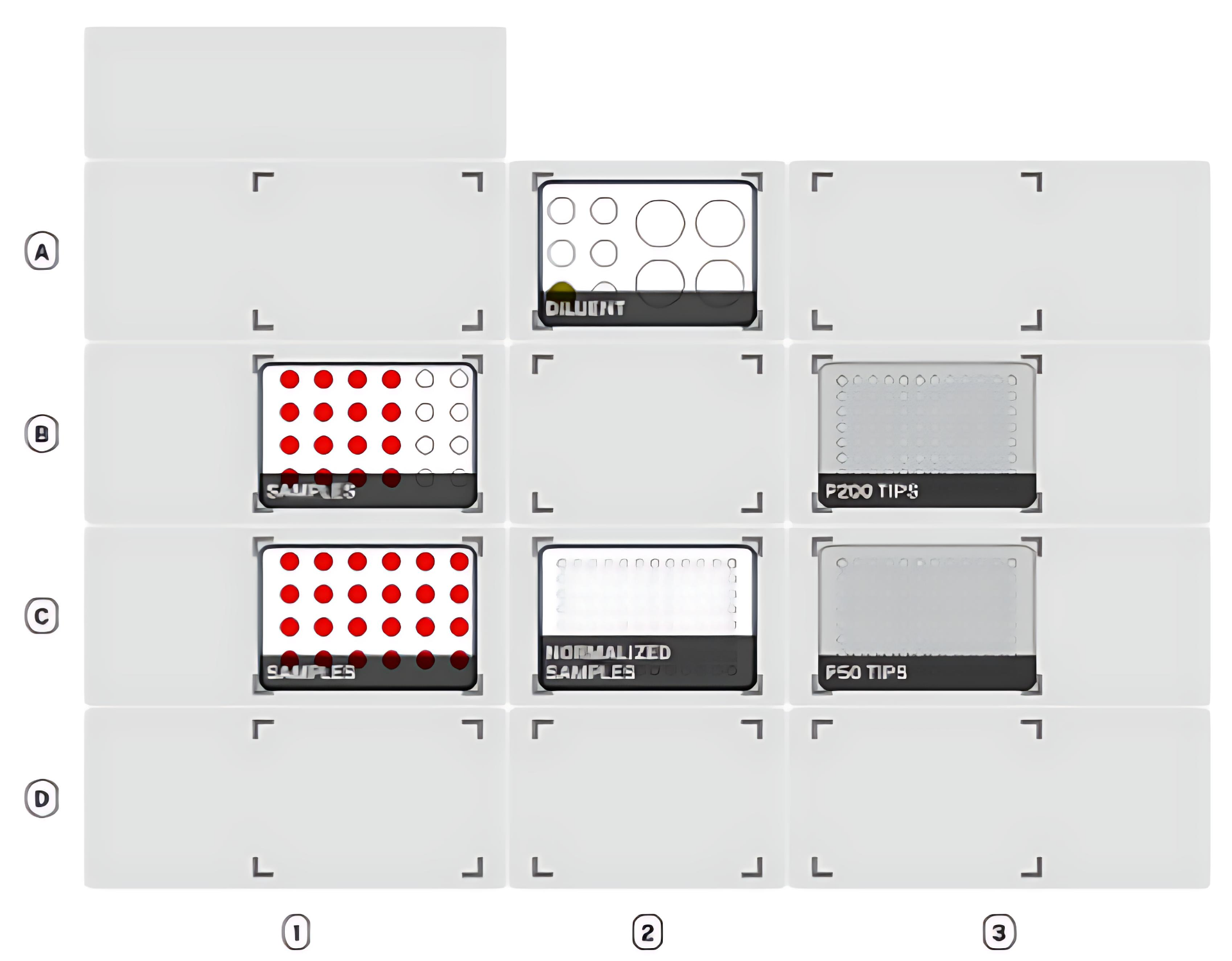 圖 2.Opentrons Flex 自動(dòng)化蛋白質(zhì)定量和均一化的甲板布局示意圖。