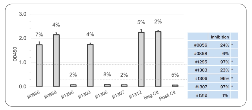 之前已通過 FDA 認(rèn)證的 ELISA 實(shí)驗(yàn)檢測(cè)結(jié)果為陽性),在該測(cè)試中呈現(xiàn)結(jié)果為陽性(抑制率 >