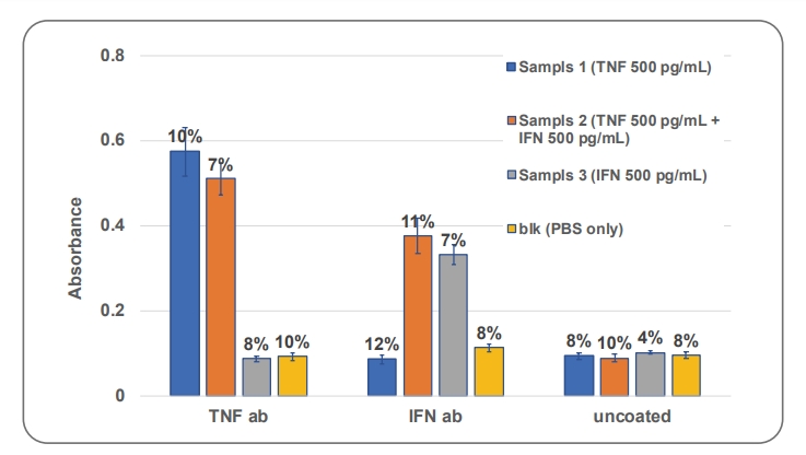 抗體和抗IFN-gamma抗體,對(duì)含有細(xì)胞因子的樣品進(jìn)行ELISA檢測(cè),數(shù)據(jù)如圖所示