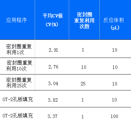 通過(guò)計(jì)算得出變異系數(shù) (CV%) 見(jiàn)表2。數(shù)據(jù)表明,密封圈可以重復(fù)使用多達(dá)25次,且不會(huì)降低性能。在10 μL 和 100μL 反應(yīng)體積下,CV值均保持較低。此外,使用 OT-2的 96孔PCR 板,在10uL 到100uL 這個(gè)較大的范圍區(qū)間內(nèi),熱循環(huán)模塊都具有較好的擴(kuò)增重復(fù)性。