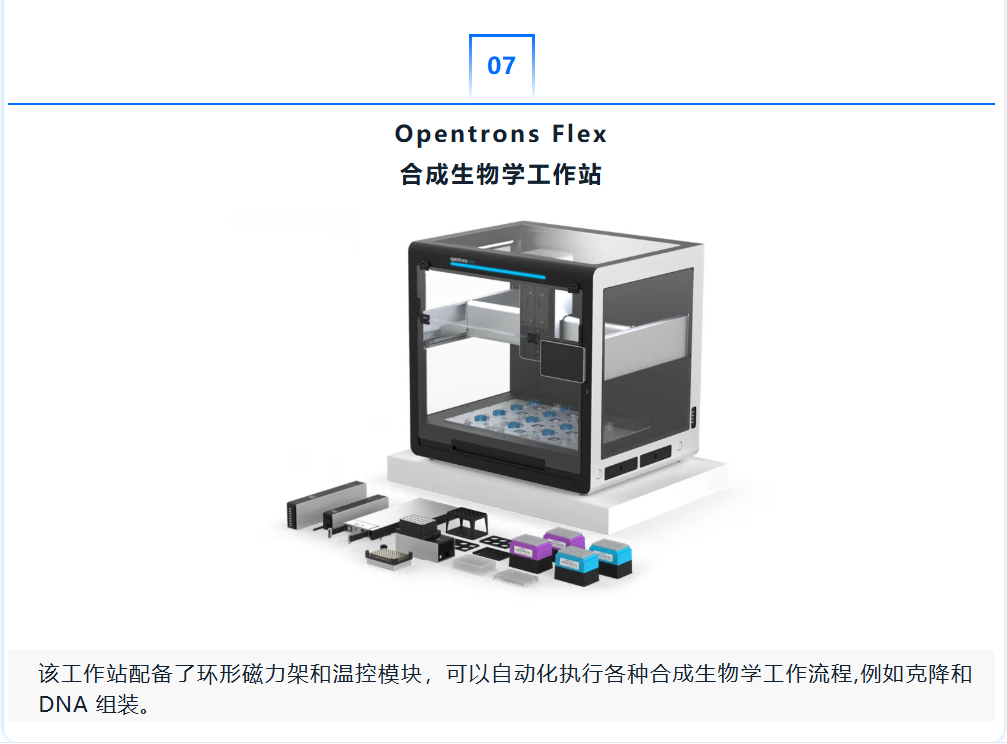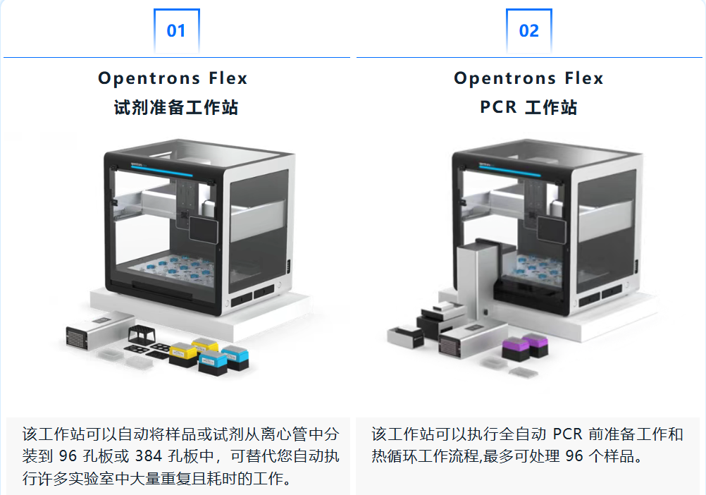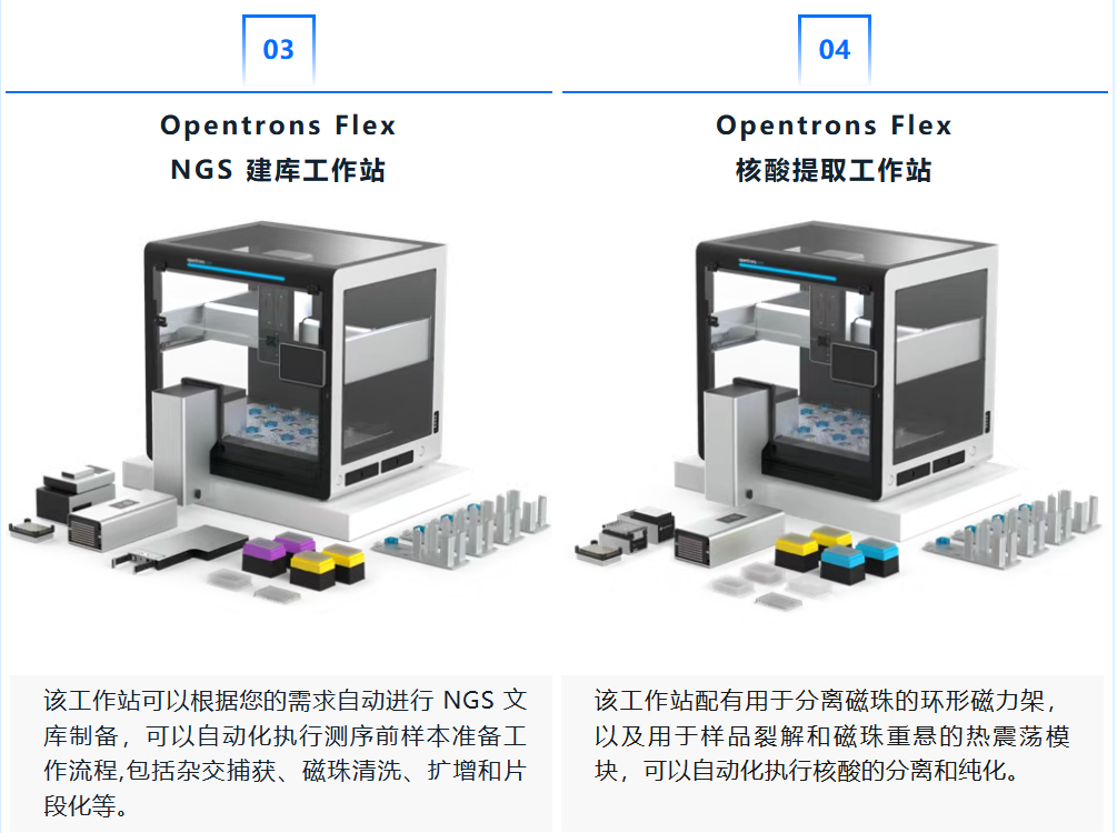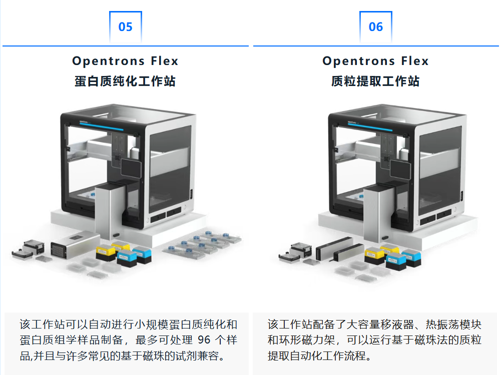 為了滿足不同實(shí)驗(yàn)需求,我們還推出了 Opentrons Flex 全新應(yīng)用解決方案,包括試劑準(zhǔn)備工作站、PCR 工作站、NGS 建庫(kù)工作站、核酸提取工作站、蛋白質(zhì)純化工作站、質(zhì)粒提取工作站以及合成生物學(xué)工作站等,這些工作站覆蓋了生命科學(xué)的多個(gè)領(lǐng)域,為科研人員提供了全面、高效的自動(dòng)化解決方案。