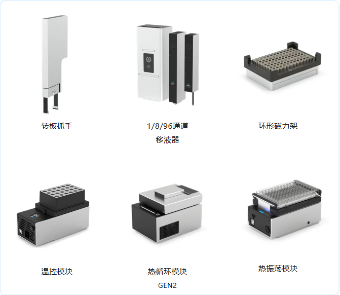 我們還推出了一系列新配件和新模組,包括 Opentrons Flex 轉(zhuǎn)板抓手、1/8/96 通道移液器、環(huán)形磁力架、溫控模塊、熱循環(huán)模塊 GEN2 和熱振蕩模塊等,這些配件和模組與 Flex 系列工作站完美融合,共同構(gòu)建成完整的自動(dòng)化實(shí)驗(yàn)平臺(tái)。