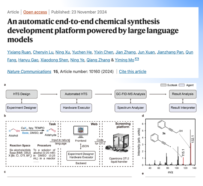 浙江大學(xué)化學(xué)工程與生物工程學(xué)院在《Nature Communications》發(fā)表最新研究成果,基于 GPT-4 驅(qū)動的反應(yīng)開發(fā)框架(LLM-RDF),構(gòu)建自動化化學(xué)合成開發(fā)平臺。其中,Opentrons 移液工作站結(jié)合 AI,用于 HTS 底物篩選、動力學(xué)研究及光催化反應(yīng)條件優(yōu)化等實驗。