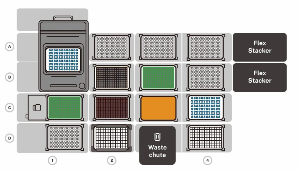 A 行:(A1) 搭載樣本板的 On-Deck PCR 模塊;(A2–A3) 吸頭盒;(A4) 配備吸頭盒的 Flex 耗材堆棧模塊