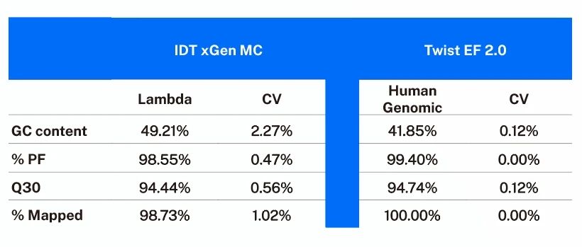 本表匯總了基于Illumina MiSeq平臺(tái)(2 × 150 測(cè)序模式)的測(cè)序數(shù)據(jù)質(zhì)量評(píng)估結(jié)果。檢測(cè)樣本包含采用IDT xGen MC 試劑盒制備的 Lambda 樣本和使用 Twist EF 2.0 試劑盒制備的人類基因組樣本。主要質(zhì)量指標(biāo)包括:GC 含量、PF%(Percent Passing Filter)、Q30 值(Quality >30的百分比)及 比對(duì)率(Percent Mapped)。