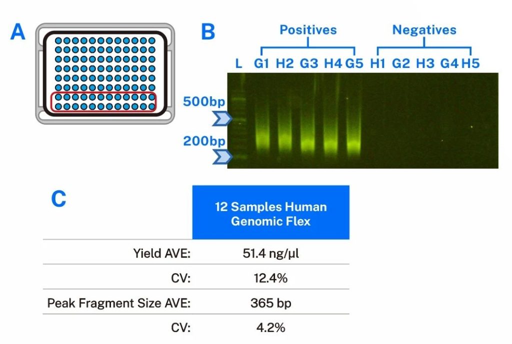 (B) 文庫(kù)片段大小,使用 2% E-Gel 電泳分析,配有 E-Gel DNA Ladder,展示典型的陽(yáng)性與陰性樣本