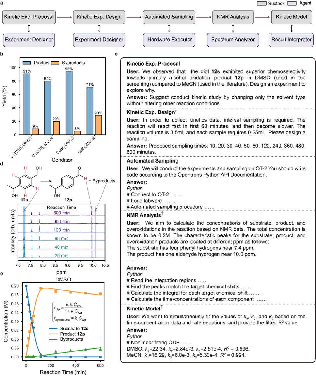 研究人員觀察到,在HTS實(shí)驗(yàn)中使用DMSO作為溶劑時(shí),反應(yīng)底物12s中伯羥基的氧化選擇性優(yōu)于其在文獻(xiàn)中使用MeCN作為溶劑時(shí)的情況(圖3b)。為進(jìn)一步研究這種溶劑效應(yīng),該團(tuán)隊(duì)開展了動(dòng)力學(xué)研究。在此過程中,Experiment Designer設(shè)計(jì)了一個(gè)為期10小時(shí)的采樣方案(圖3c)。隨后,Hardware Executor生成了OT-2移液工作站的運(yùn)行代碼,實(shí)現(xiàn)了自動(dòng)采樣操作。采集到的反應(yīng)樣品通過1H NMR進(jìn)行分析,Spectrum Analyzer基于目標(biāo)產(chǎn)物12p的化學(xué)位移信息,自動(dòng)識(shí)別NMR峰、完成峰面積積分并計(jì)算樣品組成(圖3d)。最后,Result Interpreter基于實(shí)驗(yàn)結(jié)果擬合動(dòng)力學(xué)模型,計(jì)算反應(yīng)速率常數(shù)(k?、k?、k?),并發(fā)現(xiàn)在MeCN中產(chǎn)物過氧化速率常數(shù)(k?)顯著高于DMSO,表明溶劑對(duì)反應(yīng)選擇性具有重要影響(圖3e)。
