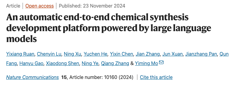 此研究開發(fā)了一個(gè)基于LLM的反應(yīng)開發(fā)框架(LLM-RDF),成功實(shí)現(xiàn)了醇類氧化為醛反應(yīng)從文獻(xiàn)檢索到產(chǎn)品純化的全流程開發(fā)。隨后,LLM-RDF在三個(gè)實(shí)際化學(xué)合成開發(fā)任務(wù)中進(jìn)一步驗(yàn)證了其適用性,展現(xiàn)了其在合成方法搜索、自動(dòng)化設(shè)備代碼生成、波譜分析、化學(xué)計(jì)量計(jì)算、分離條件優(yōu)化和反應(yīng)器設(shè)計(jì)等任務(wù)中的自主研究與決策能力。通過結(jié)合化學(xué)家、LLM智能體和自動(dòng)化實(shí)驗(yàn)平臺(tái),LLM-RDF顯著簡(jiǎn)化了傳統(tǒng)上以專家為主導(dǎo)的勞動(dòng)密集型反應(yīng)開發(fā)流程。此研究中,智能體之間的通信仍通過人為中介完成,以審查實(shí)驗(yàn)計(jì)劃和結(jié)果。未來,隨著LLM可靠性進(jìn)一步提升,可開發(fā)類似AutoGen框架的多智能體系統(tǒng),實(shí)現(xiàn)智能體直接通信,減少人工介入,僅在關(guān)鍵決策時(shí)提供支持,從而大幅提升反應(yīng)開發(fā)的自主性和效率,為化學(xué)合成開發(fā)的智能化和自動(dòng)化奠定基礎(chǔ)。