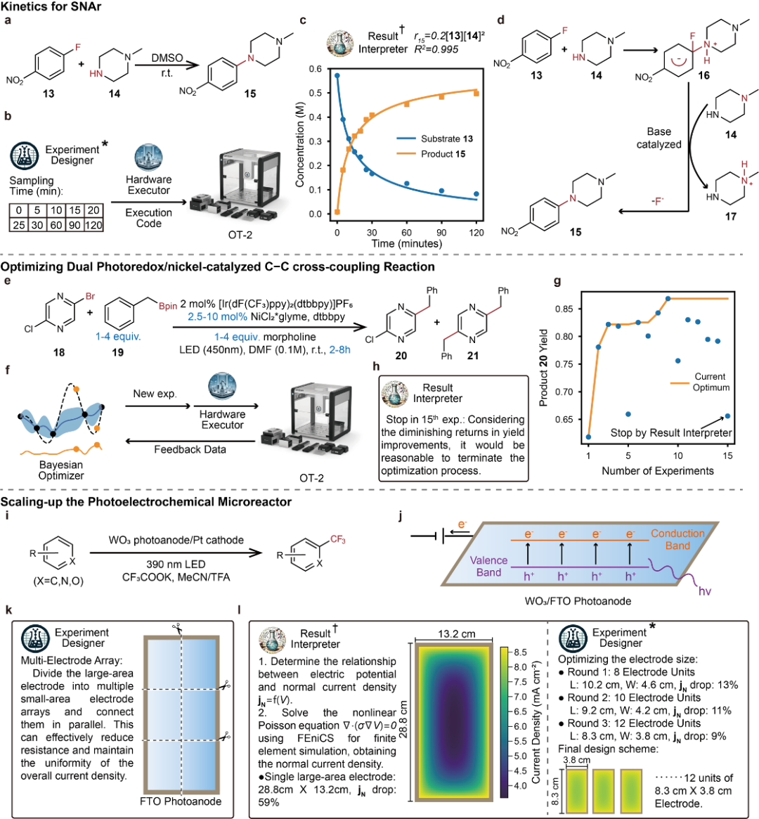 該研究團(tuán)隊(duì)進(jìn)一步探索了LLM-RDF在實(shí)際化學(xué)合成開發(fā)任務(wù)中的適用性,通過了三個(gè)具體案例進(jìn)行驗(yàn)證:親核芳香取代(SNAr)反應(yīng)的反應(yīng)動(dòng)力學(xué)研究,光催化C-C交叉偶聯(lián)反應(yīng)的反應(yīng)條件優(yōu)化,以及非均相光電化學(xué)反應(yīng)器的放大設(shè)計(jì)(圖6)。