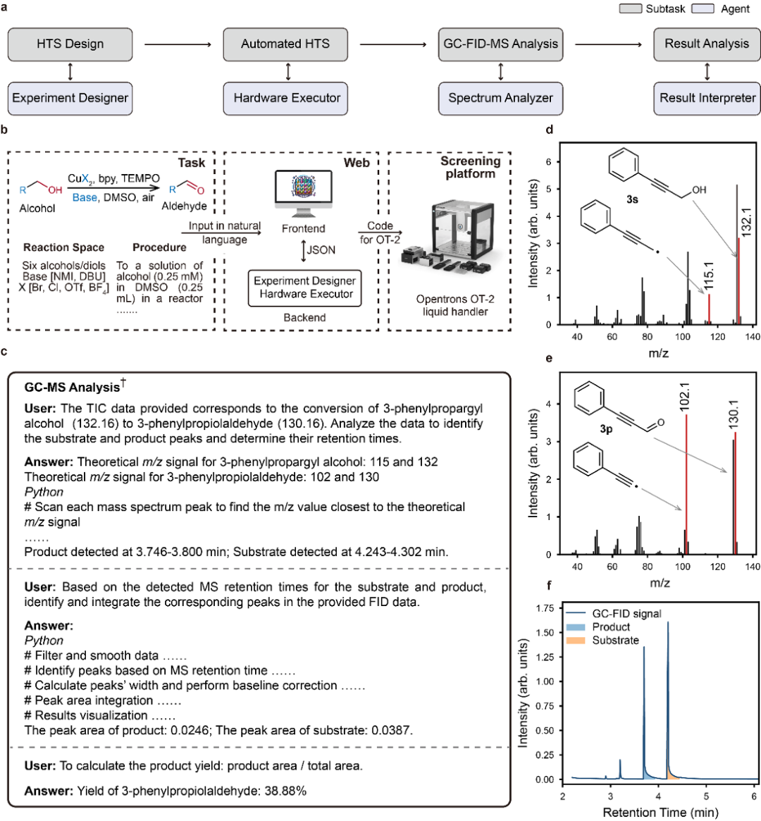 該研究選擇了好氧醇氧化這一新興的可持續(xù)醛類合成方法作為模式反應(yīng),并通過Literature Scouter獲取文獻(xiàn)中報(bào)道的銅/TEMPO催化醇氧化方法。隨后,對(duì)找到的醇氧化反應(yīng)方法開展了底物適用性和反應(yīng)條件的高通量篩選(HTS)。在此過程中,Experiment Designer解析了HTS實(shí)驗(yàn)任務(wù),隨后Hardware Executor將其轉(zhuǎn)化為OT-2移液工作站的Python執(zhí)行代碼,實(shí)現(xiàn)了自動(dòng)化實(shí)驗(yàn)操作(圖2b)。實(shí)驗(yàn)結(jié)束后,Spectrum Analyzer根據(jù)實(shí)驗(yàn)樣品的GC-FID-MS波譜數(shù)據(jù),自動(dòng)識(shí)別了底物和產(chǎn)物的特征質(zhì)譜峰,確定其保留時(shí)間,并對(duì)對(duì)應(yīng)的FID信號(hào)進(jìn)行積分得到反應(yīng)收率(圖2c-f)。最后,Result Interpreter智能體總結(jié)了HTS結(jié)果,發(fā)現(xiàn)堿DBU顯著優(yōu)于NMI,銅鹽活性順序?yàn)镃uCl2 < CuBr2 < Cu(OTf)2 ~ Cu(BF4)2。Result Interpreter同時(shí)還發(fā)現(xiàn)位于吸電子官能團(tuán)α位的醇羥基反應(yīng)活性有所增強(qiáng),但它仍不能對(duì)某些底物完全無法反應(yīng)的原因進(jìn)行深入分析。