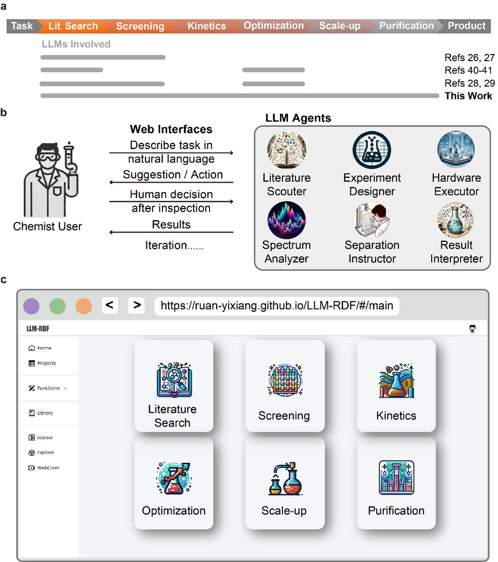 開發(fā)了一個(gè)基于LLM的反應(yīng)開發(fā)框架(LLM-RDF),整合了從文獻(xiàn)搜索、高通量反應(yīng)篩選、反應(yīng)動(dòng)力學(xué)研究、反應(yīng)條件優(yōu)化和規(guī)模放大到產(chǎn)品純化的所有關(guān)鍵任務(wù),實(shí)現(xiàn)了對(duì)化學(xué)合成開發(fā)的全流程覆蓋。