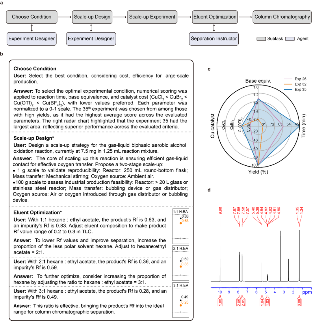 基于前期優(yōu)化的高產(chǎn)率條件,由Experiment Designer選擇了第35次實(shí)驗(yàn)的條件(反應(yīng)時(shí)間45分鐘、催化劑Cu(OTf)?、1.34當(dāng)量的堿DBU)進(jìn)行規(guī)模放大(圖5c)。隨后,Experiment Designer提出了逐級(jí)放大策略:先在1 g規(guī)模驗(yàn)證反應(yīng)的可重復(fù)性和穩(wěn)定性,再擴(kuò)展至100 g規(guī)模評(píng)估工業(yè)生產(chǎn)可行性,其中強(qiáng)調(diào)了氣液兩相有效接觸和充足氧氣供應(yīng)的重要性,并精確計(jì)算了試劑配比,研究人員隨后基于此進(jìn)行了1 g規(guī)模的放大實(shí)驗(yàn)。純化階段,Separation Instructor經(jīng)兩輪決策后確定洗脫液比例為正己烷:乙酸乙酯=3:1,此條件下目標(biāo)產(chǎn)物12p的Rf值為0.28,雜質(zhì)的Rf值為0.49,達(dá)到有效分離(圖5b)。最終,使用自動(dòng)過柱機(jī)分離得到915 mg產(chǎn)品,純度>98%,分離收率為86%(圖5d)。