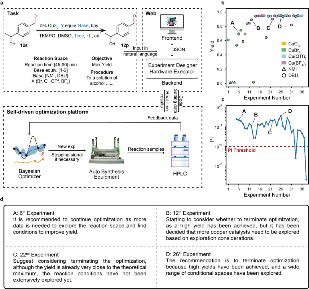 該研究團(tuán)隊(duì)同時(shí)對(duì)二元醇底物12s進(jìn)行了反應(yīng)條件優(yōu)化,以最大化反應(yīng)收率。通過網(wǎng)頁(yè)界面以自然語言描述優(yōu)化任務(wù)后,Experiment Designer和Hardware Executor智能體將信息轉(zhuǎn)化為結(jié)構(gòu)化數(shù)據(jù),并傳遞至自驅(qū)動(dòng)優(yōu)化平臺(tái)。該平臺(tái)由貝葉斯優(yōu)化器、自動(dòng)化合成設(shè)備和HPLC組成,分別負(fù)責(zé)提出新反應(yīng)條件、執(zhí)行實(shí)驗(yàn)和分析結(jié)果,實(shí)時(shí)優(yōu)化進(jìn)展會(huì)顯示在網(wǎng)頁(yè)界面中供用戶查看(圖4a)。優(yōu)化過程中采用了基于PI準(zhǔn)則(計(jì)算新條件是否可能成為最優(yōu)條件的可能性)的停止策略。在36次實(shí)驗(yàn)后,PI停止準(zhǔn)則被滿足,找到了多個(gè)高收率反應(yīng)條件(圖4b-c)。同時(shí)Result Interpreter在第26次實(shí)驗(yàn)后建議終止,其指出反應(yīng)收率已接近理論最大值,且反應(yīng)空間探索已充分。如按此建議終止可減少10次實(shí)驗(yàn),且優(yōu)化結(jié)果無明顯差異(圖4d)。這表明Result Interpreter在優(yōu)化過程中有效平衡了探索和利用(exploration and exploitation),體現(xiàn)出了其決策的合理性。